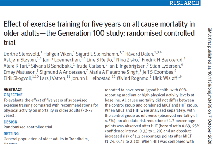 [1]Stensvold Dorthe, Viken Hallgeir, Steinshamn Sigurd L, Dalen Håvard, Støylen Asbjørn, Loennechen Jan P et al. Effect of exercise training for five years on all cause mortality in older adults—the Generation 100 study: randomised controlled trial BMJ 2020; 371 :m3485