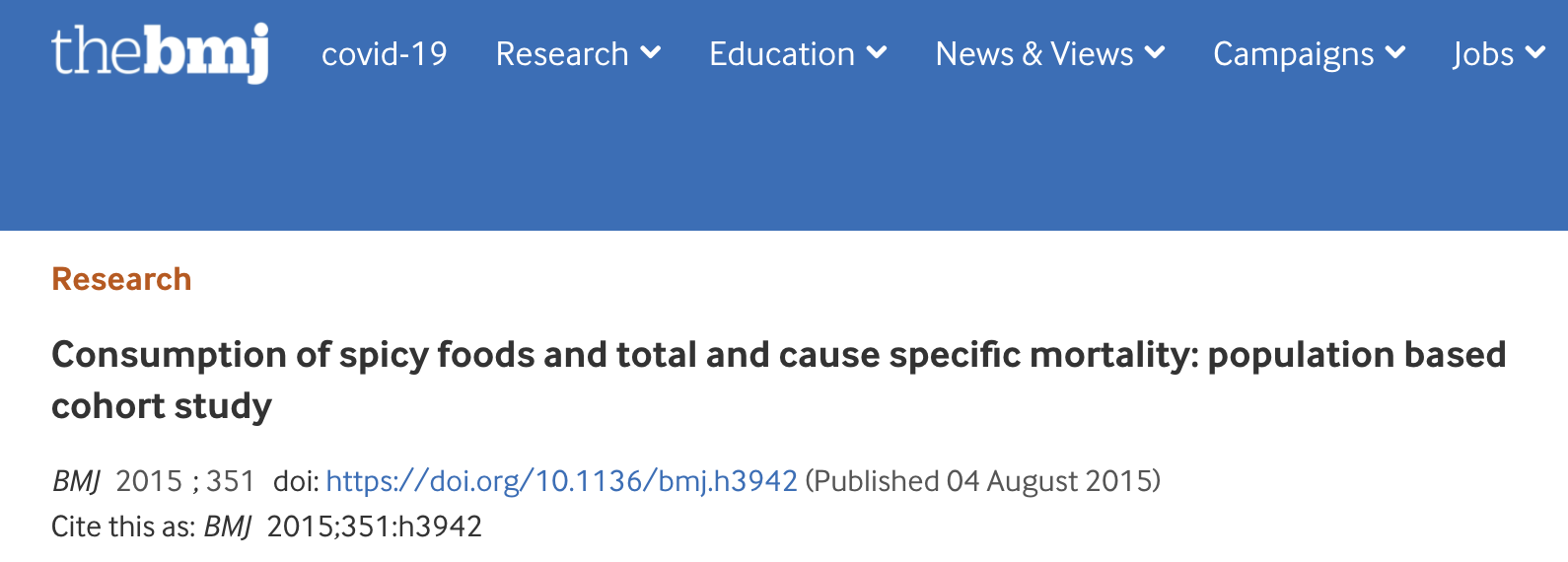 《英国医学杂志》上发布一项关于吃辣和死亡风险的研究。哈佛大学的研究人员对50万名年龄在30-79岁的中国人进行了调查分析,发现每周吃辣1-2次的人比不吃辣的人全因死亡率减少了10%,每周吃辣3-7次的人死亡率更是下降了14%。